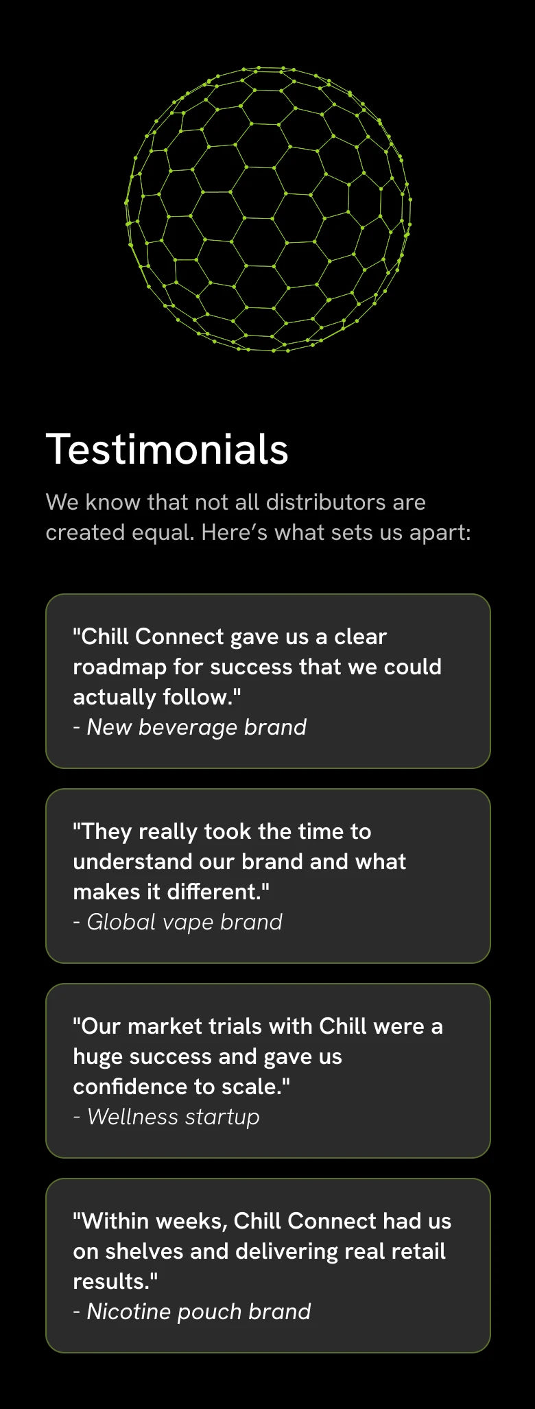 Whether you’re launching in 50 stores or 500, Chill Connect helps you go to market with intent, structure, and energy. When your brand needs to show up and be remembered, we bring the team and tools to make it happen.